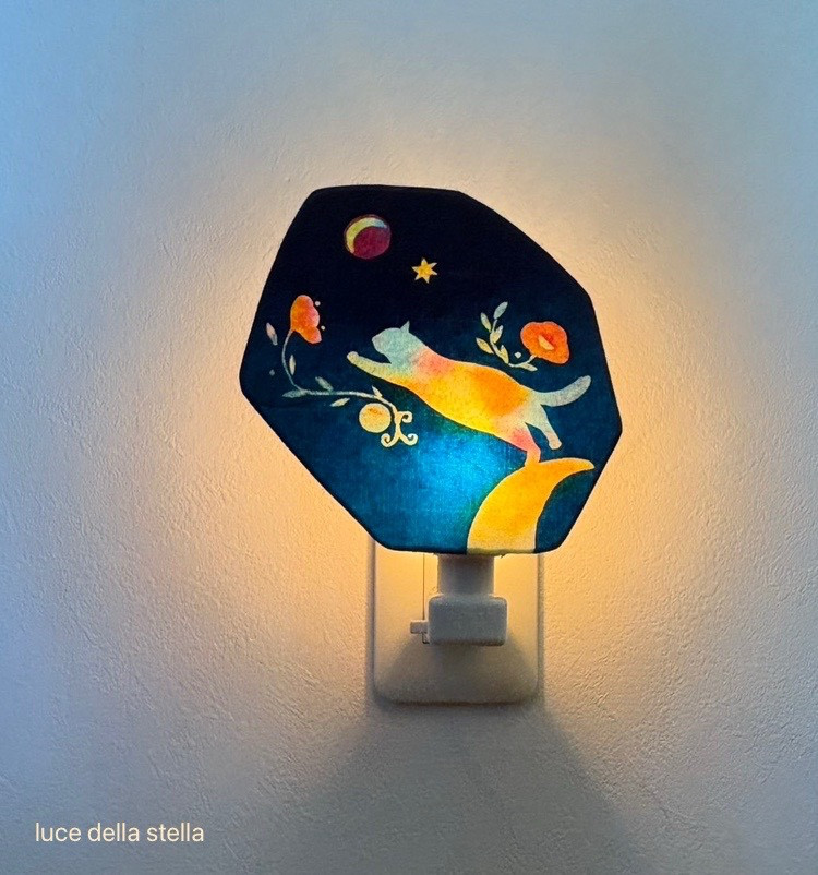 ご覧下さりありがとうございます。 「月の船」… 大空を海にみなして、月が空を行くさまを、漕ぎ行く船にたとえていう言葉。 ・1枚、1枚和紙にロウケツ染めの技法で丁寧に描いています。色の出方など個体差がありますのでご了承下さいませ。 ・周りの縁取りにシルバーのアクリル絵の具を塗っております。 ・明かりを付けるとお月様や猫が浮かび上がり、消しても絵を飾っているかのように、お部屋を華やかに彩ります。 インテリアとして明かりを楽しんで頂けたら嬉しいです。 ▶︎手描きですので1点ものとなります。 ☆ブルーライトに疲れた目にも、不眠の方にも足元を優しく照らすナイトランプの光は睡眠導入に良い効果をもたらすと言われています。 ・ろうけつ染めの技法を用いて和紙に染色をしています。印刷ではありません。シェードも鉄線から形作り、全て手作業で作っています。 ☆1日8時間点灯し、電気代 1か月約25円 ご購入される前にお読みください→https://www.creema.jp/item/6742703/detail 授乳の時や、夜に何度もトイレに行く方へのプレゼントにも。 周りの人を起こす事なく、暖かい光で包んでくれますよ。 ・大きさ約 縦 18㎝(ソケット含む)×横14㎝×奥行き6㎝(差込口除く) ・裏打ちした和紙を貼り付けておりますので重さ約65グラムと軽く、プラグの抜き差しもしやすくなっております。 ・染色の工程回数や制作時間などにより価格に差があります事をご了承ください ・和紙の特性上シワなどありますが、照明用ワーロンで裏打ちしていますので破れる心配はありません。 ▶︎プレゼント包装もしております(写真は例です)送り主様に直接のご配送も承ります。 ▶︎普通郵便はお届けまでに以前よりも日数がかかるようになってきております。お急ぎのお客さまはヤマト運輸でご希望の日時に配送することが出来ますのでこちらをご選択下さいませ。 |
